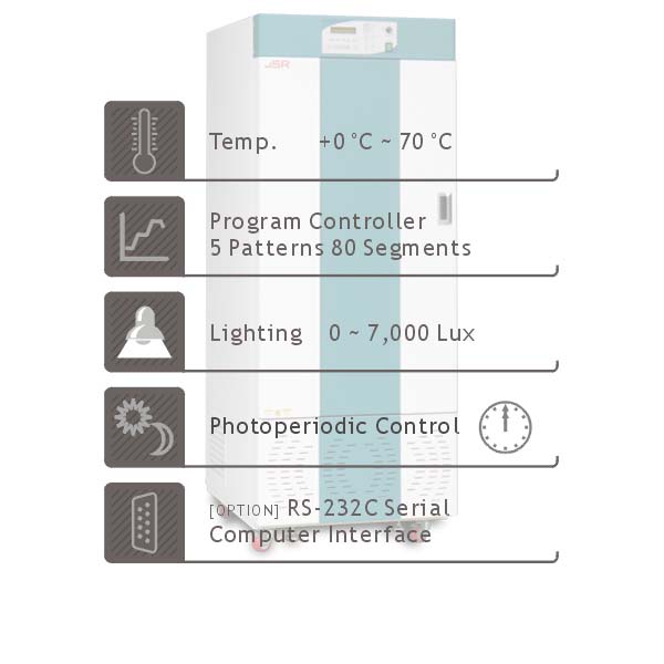 JSCC-Series Plant Tissue Culture Chamber controls temperature and light for photoperiodic day-night simulation to provide controlled climatic condition for crop plants or photosynthetic organisms. Culture conditions such as temperature and light ON/OFF are programmable in 5 pattern memory, up to 80 segments for each pattern, light ON/OFF, temperature range from +0°C to 70°C